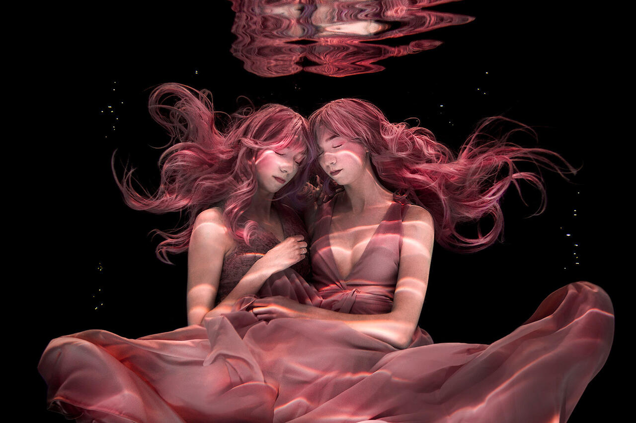 Floating weightless, time conceptualizes and almost stops. Holding one’s breath, heart rate slows its pace and unworldly thoughts and visuals spear the mind. I’m in a dream interchangeable from reality. I’m drowning in a fantasy world, holding on to the edge of the water, creating the dual mirror of this reality